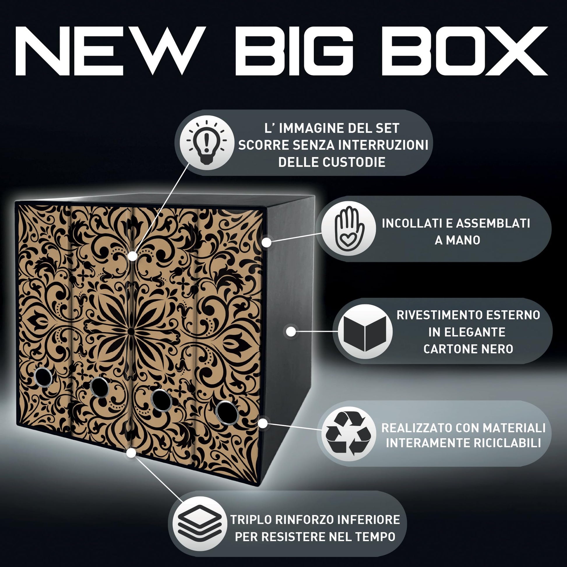 - BOX Realizzato in cartone incollato a mano, contiene il set di raccoglitori con l'immagine che non viene interrotta dalle tradizionali custodie