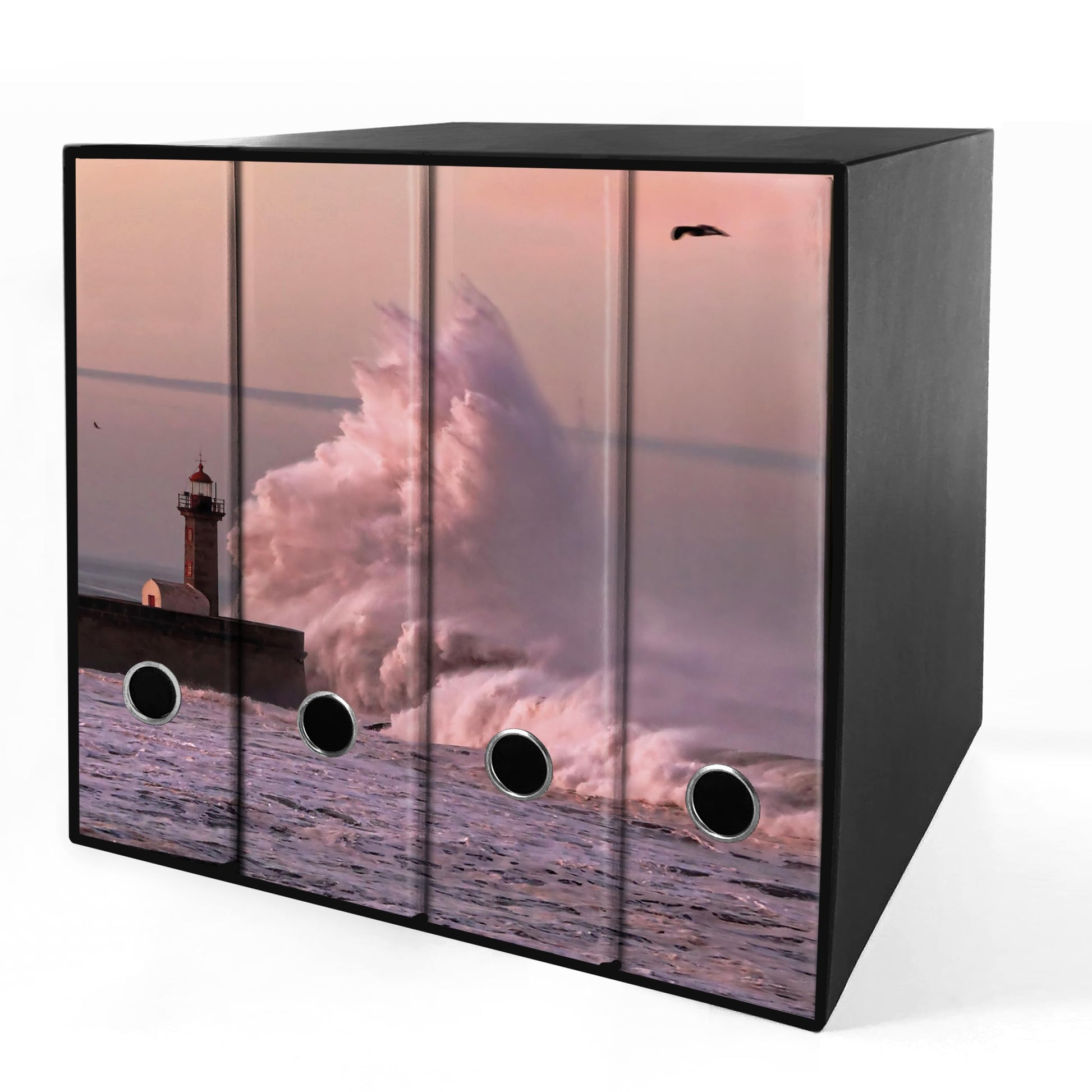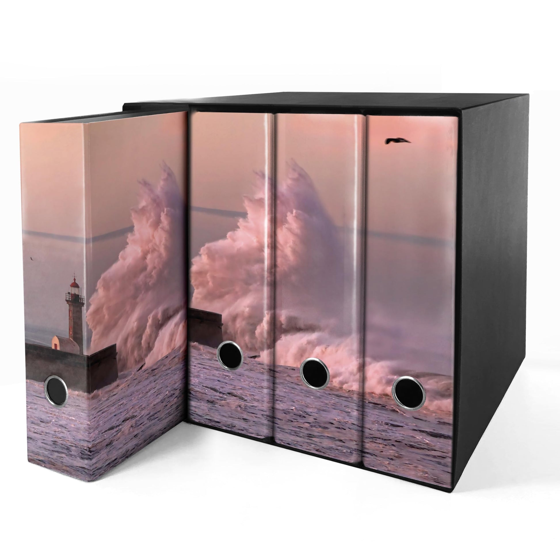 - BOX Realizzato in cartone incollato a mano, contiene il set di raccoglitori con l'immagine che non viene interrotta dalle tradizionali custodie